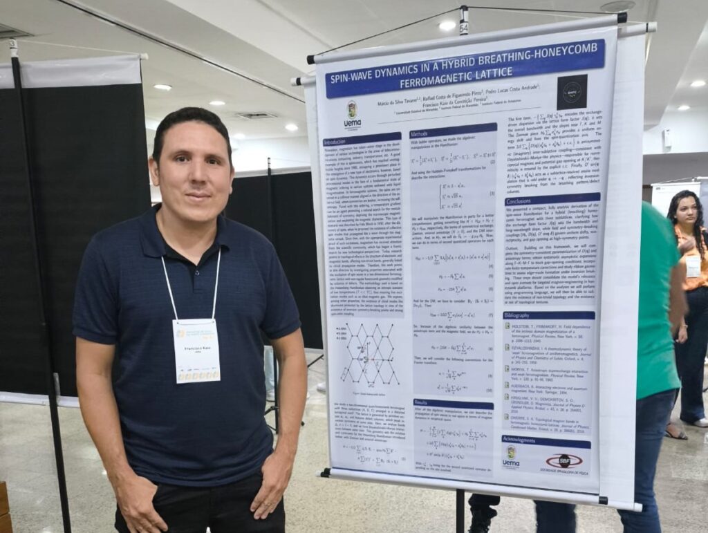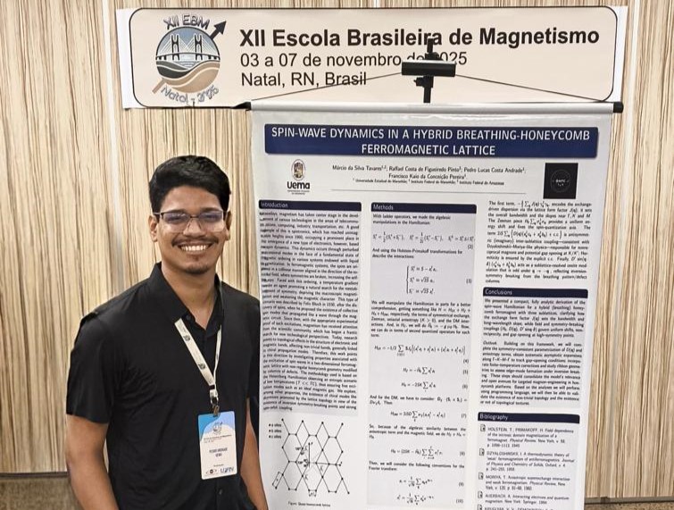 O trabalho intitulado “Dinâmica de ondas de rotação em uma estrutura ferromagnética híbrida de favo de mel com respiração”, foi apresentado por Francisco Kaio no XXXIX EFNNE e por Pedro Lucas na XII Escola Brasileira de Magnetismo. O estudo contribuiu para a ampliação do entendimento sobre fenômenos magnéticos em sistemas de rede não convencionais e contou ainda com a autoria do Prof. Márcio da Silva e Raffael Costa de Figueiredo Pinto.