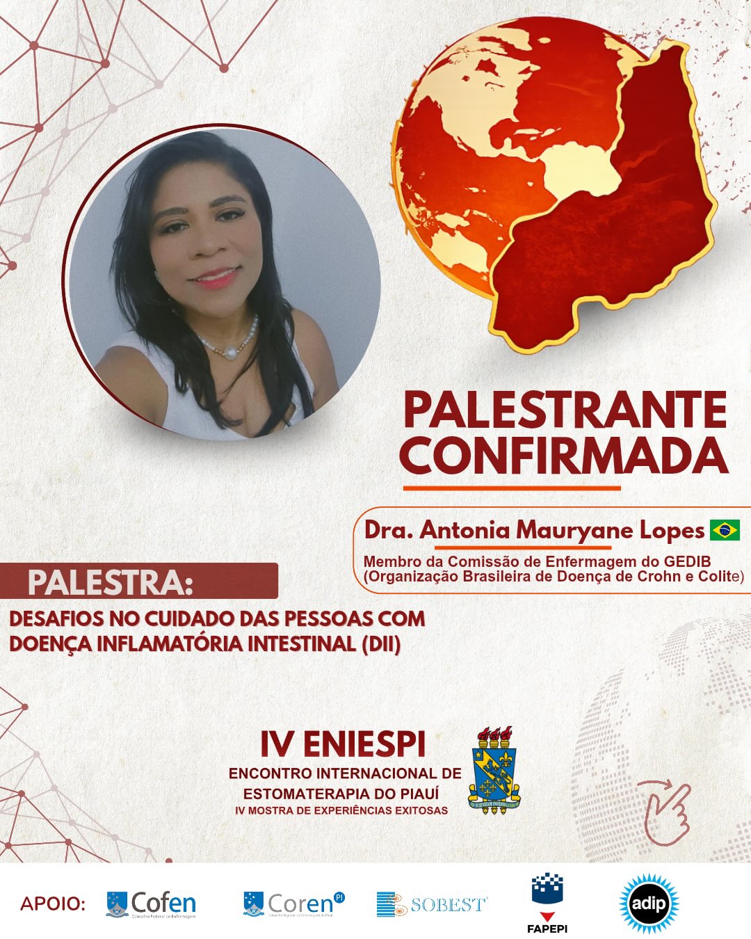 A Universidade Estadual do Maranhão (Uema), por meio do campus Colinas, participará do IV Encontro Internacional de Estomaterapia (ENIESPI), com a presença da professora Antonia Mauryane Lopes. O evento será realizado entre os dias 26 e 28 de março de 2026, em Teresina (PI) .