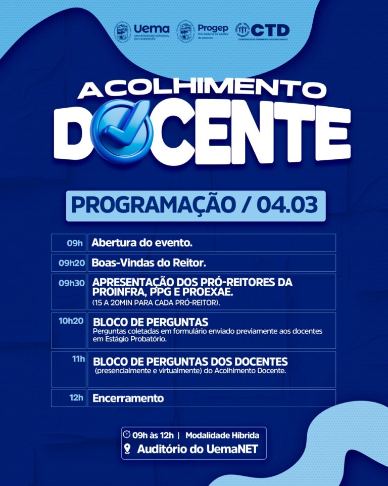 A Universidade Estadual do Maranhão (Uema), por meio da Pró-Reitoria de Gestão de Pessoas (Progep), realizará nesta quarta-feira (4) o segundo dia do Acolhimento Docente, programação voltada aos professores em estágio probatório. A ação tem como foco a integração institucional, a orientação administrativa e o fortalecimento do vínculo dos novos docentes com a Universidade.