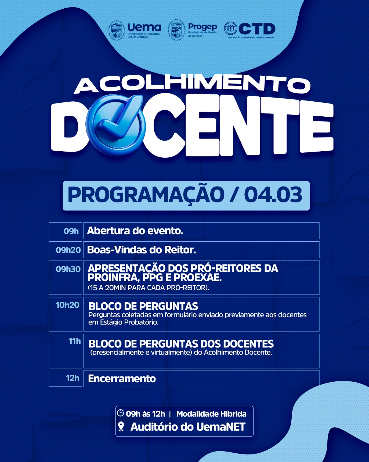 O encontro ocorrerá das 9h às 12h, em modalidade híbrida. A atividade presencial será realizada no Auditório do Uemanet, no Campus Paulo VI, com transmissão simultânea para os demais campi da instituição. Os professores do Campus Paulo VI foram especialmente convidados a participar presencialmente, mas todos os docentes em estágio probatório poderão acompanhar a programação de forma online.