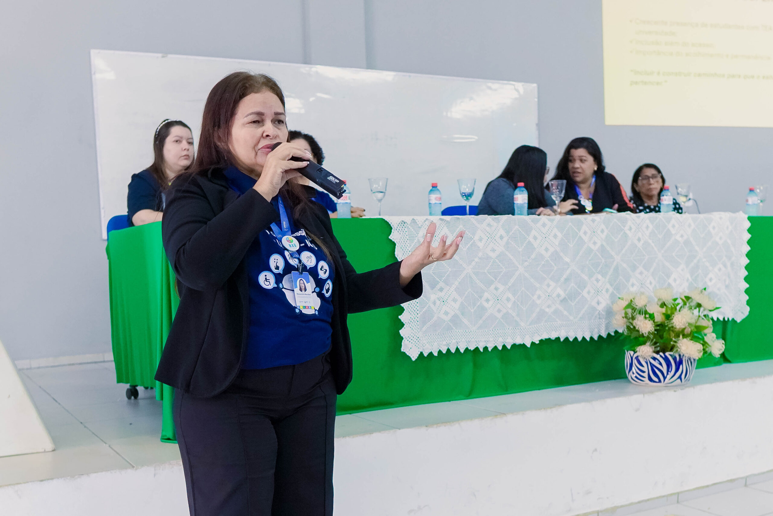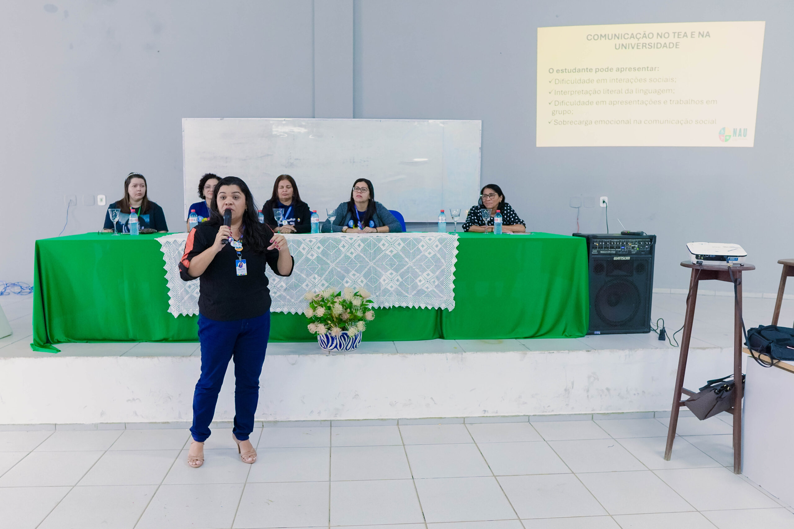 A estudante Ana Paula, do curso de Biologia, também participou do debate e compartilhou sua vivência como aluna autista assistida pelo NAU. Em sua fala, apresentou um panorama sobre a realidade de estudantes com TEA na universidade, destacando desafios cotidianos e a importância do suporte institucional para garantir sua permanência acadêmica.