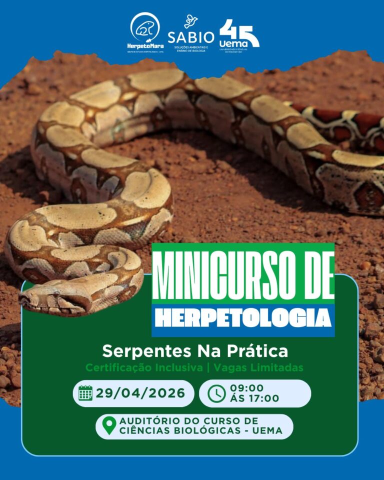 A Universidade Estadual do Maranhão (Uema), por meio da empresa júnior Sábio (Soluções Ambientais e Ensino de Biologia) em parceria com a Herpetomara, realizará no dia 29 de abril o minicurso “Serpentes na Prática”. O evento acontecerá no Auditório de Biologia da Uema, com programação das 9h às 12h para a parte teórica e das 14h às 17h para a atividade prática, totalizando oito horas de certificação.