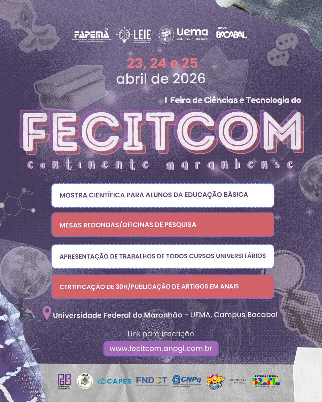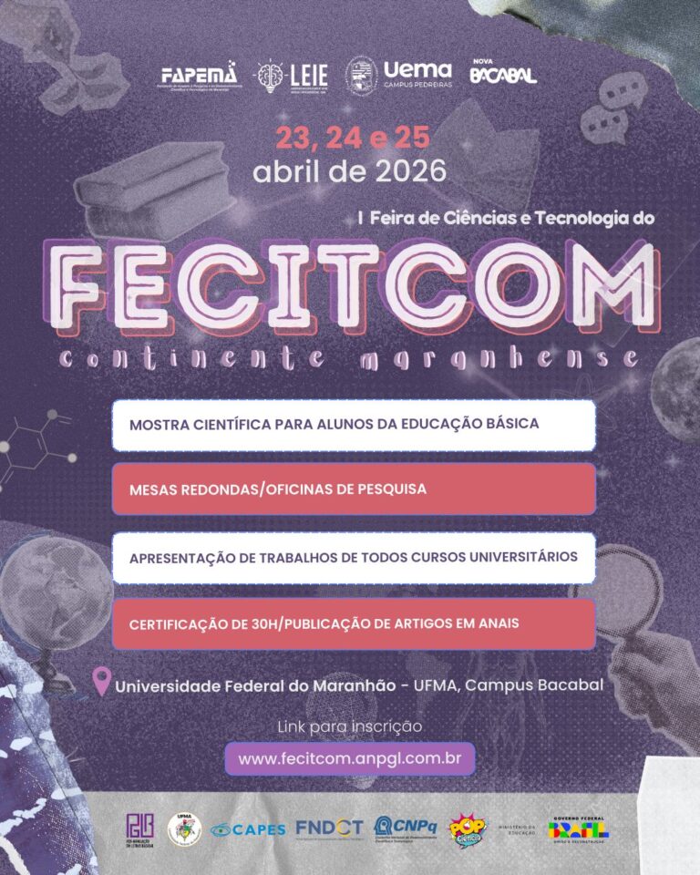 A Universidade Estadual do Maranhão (Uema) está organziando a I Feira de Ciências e Tecnologia do Continente Maranhense (FECITCOM), que será realizada nos dias 23, 24 e 25 de abril de 2026, no campus Bacabal da Universidade Federal do Maranhão (UFMA), em formato híbrido.