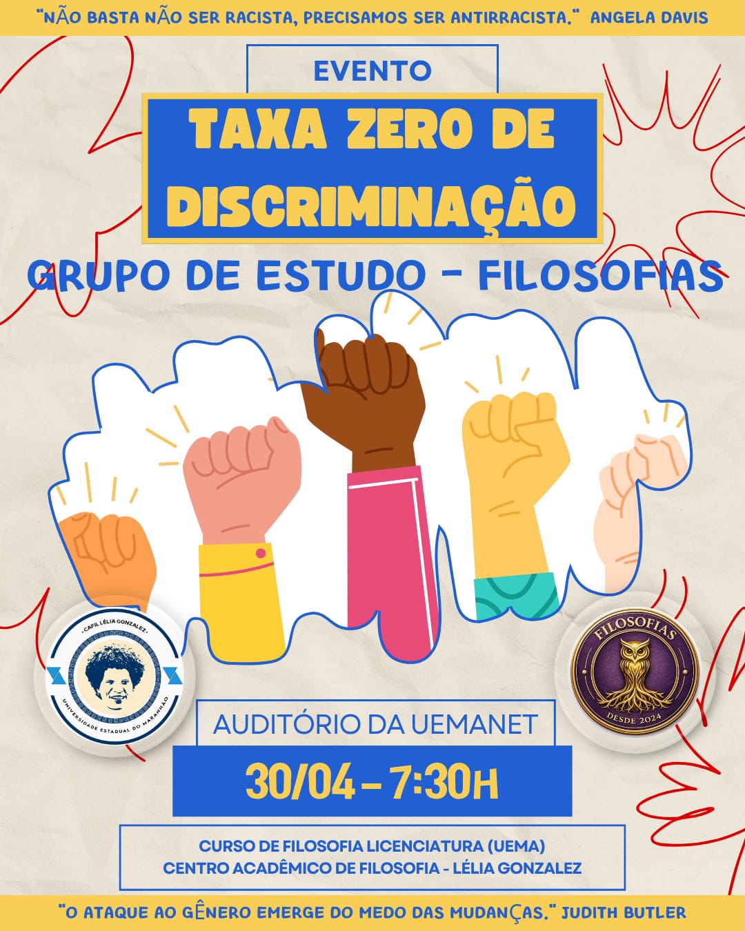 A Universidade Estadual do Maranhão (Uema) realiza, no dia 30 de maio de 2026, o evento “Zero Taxa de Discriminação”, uma iniciativa do Grupo de Estudos Filosofias em parceria com o Centro Acadêmico de Filosofia (CAFIL), do curso de Filosofia Licenciatura. O encontro acontecerá no auditório da Uemanet, em São Luís, com inscrições gratuitas por meio do Siguema.