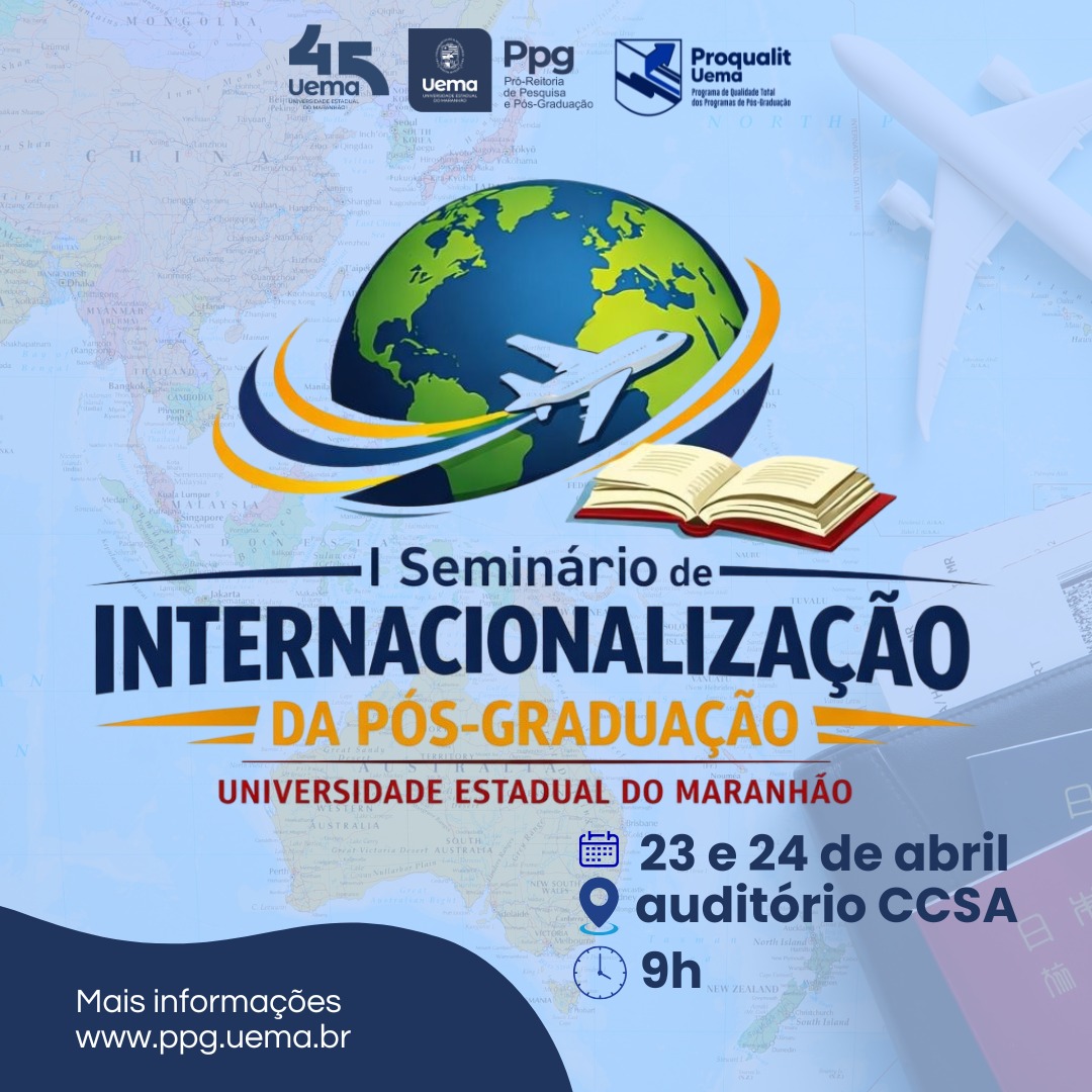 A Universidade Estadual do Maranhão (Uema), por meio da Pró-reitoria de Pesquisa e Pós-graduação (PPG), realizará, nos dias 23 e 24 de abril, no Auditório do Centro de Ciências Sociais Aplicadas (CCSA), o Seminário de Internacionalização, com uma programação voltada ao fortalecimento da pós-graduação e à discussão de estratégias para ampliar a presença institucional em redes acadêmicas nacionais e internacionais.