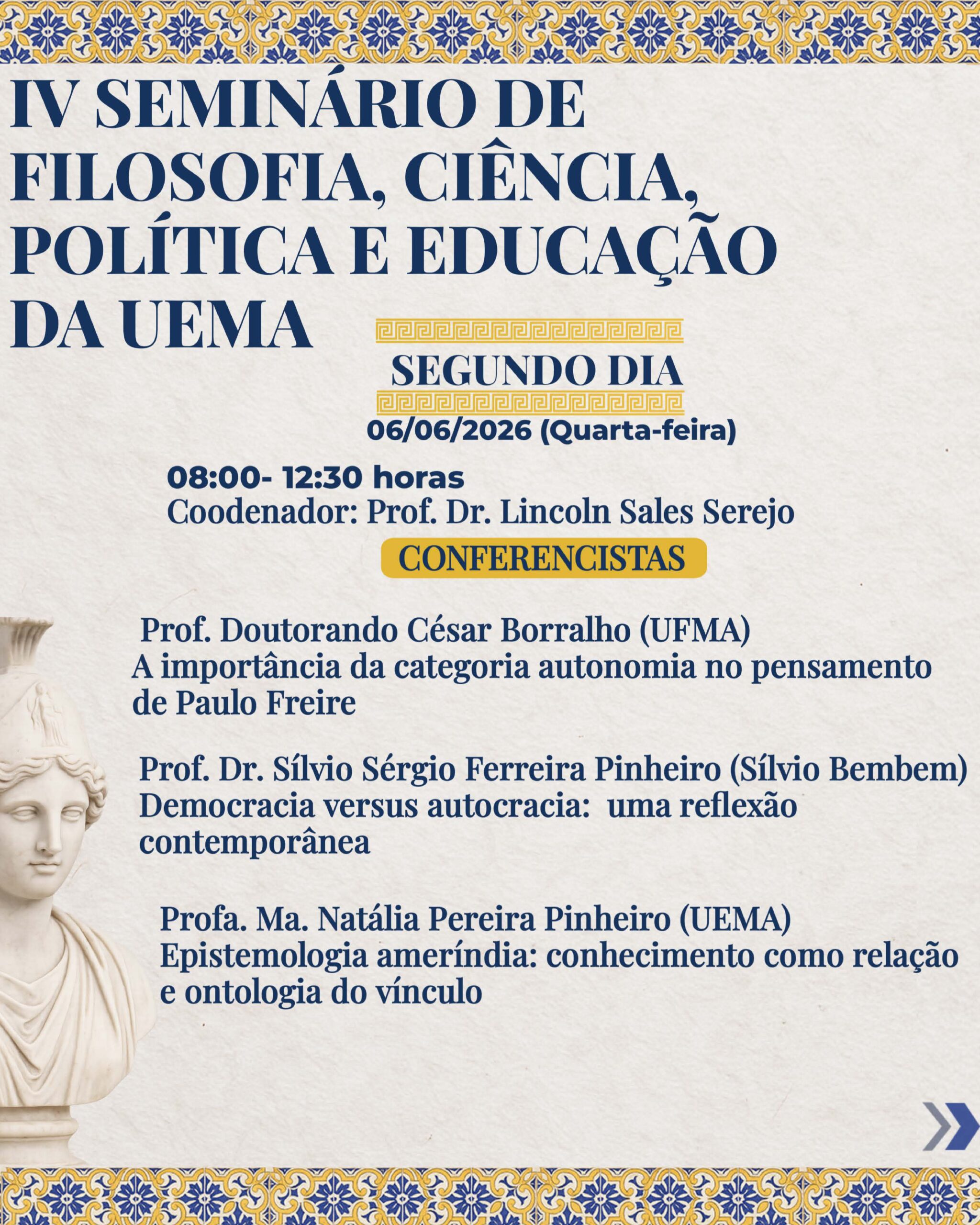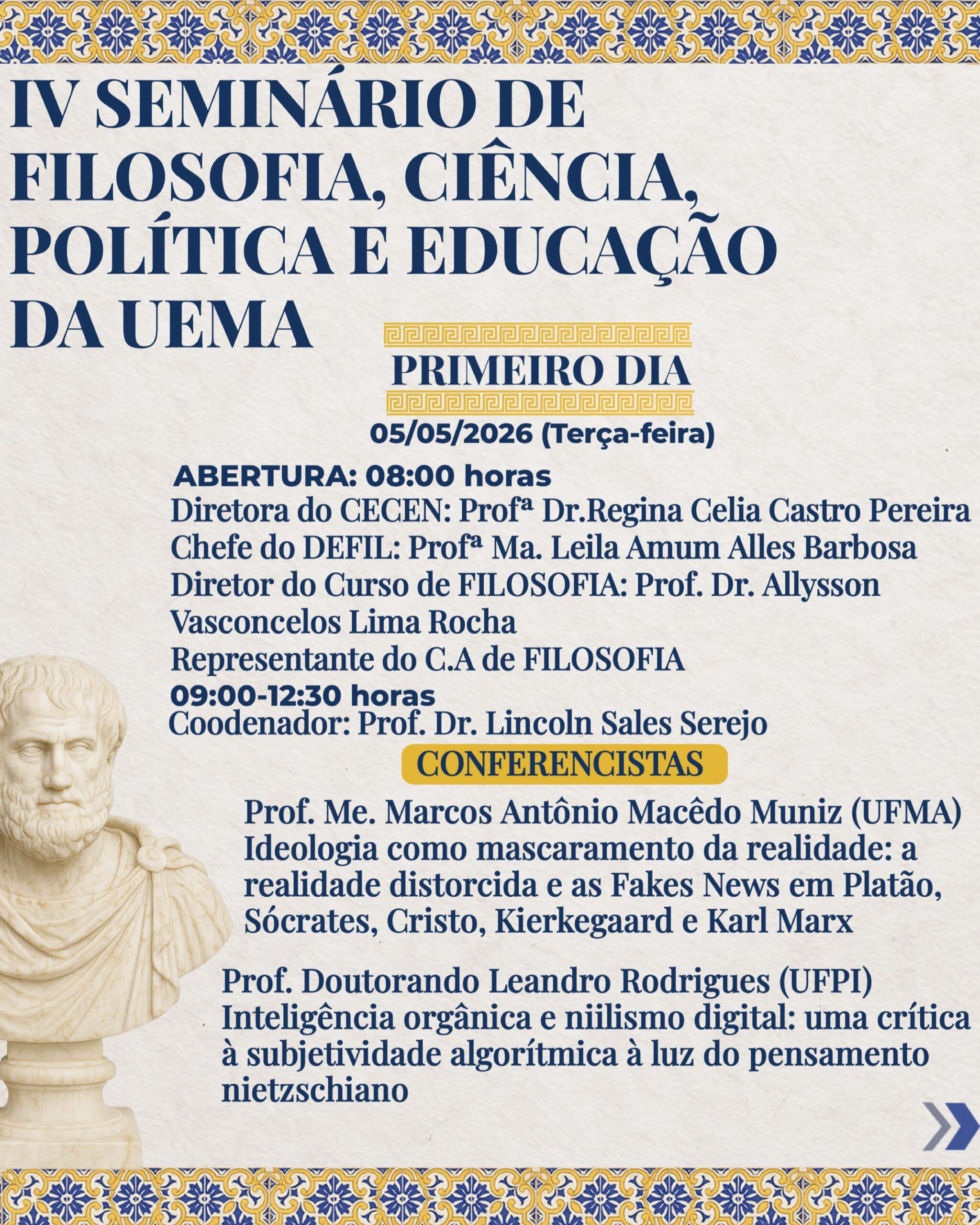 A Universidade Estadual do Maranhão (Uema), por meio do Curso de Filosofia, realizará, nos dias 5 e 6 de maio de 2026, o IV Seminário de Filosofia, Ciência, Política e Educação, no auditório do Centro de Ciências Sociais Aplicadas (CCSA), em São Luís, com o objetivo de promover o debate sobre questões contemporâneas nessas áreas.
